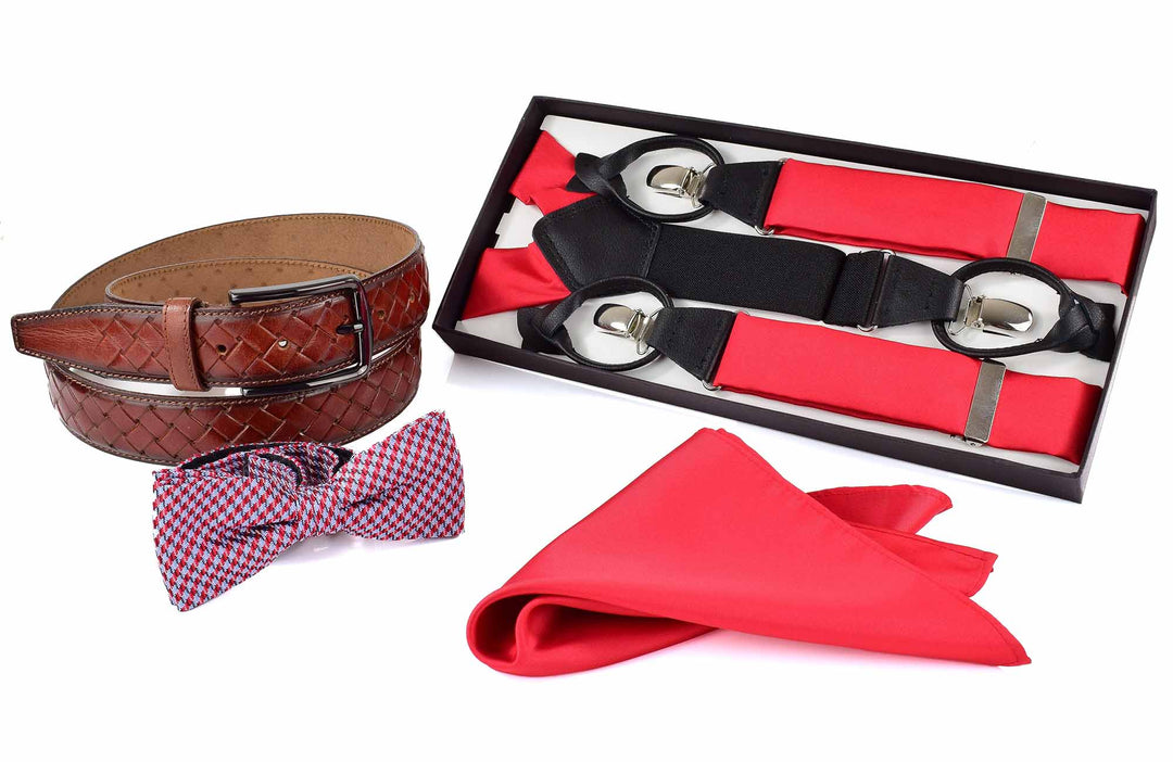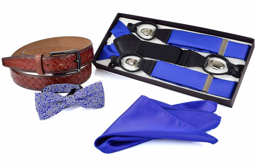 Ein absoluter Hingucker-Schleifen mit Mustern, in einem modischen und kraftvollen royalblau oder knallrot. Du hast die Wahl. Hier kannst du neben den beiden Farben ebenfalls entscheiden, ob du lieber Gürtel oder Hosenträger in deinem Set haben möchtest. Es gibt natürlich auch das komplette Set.